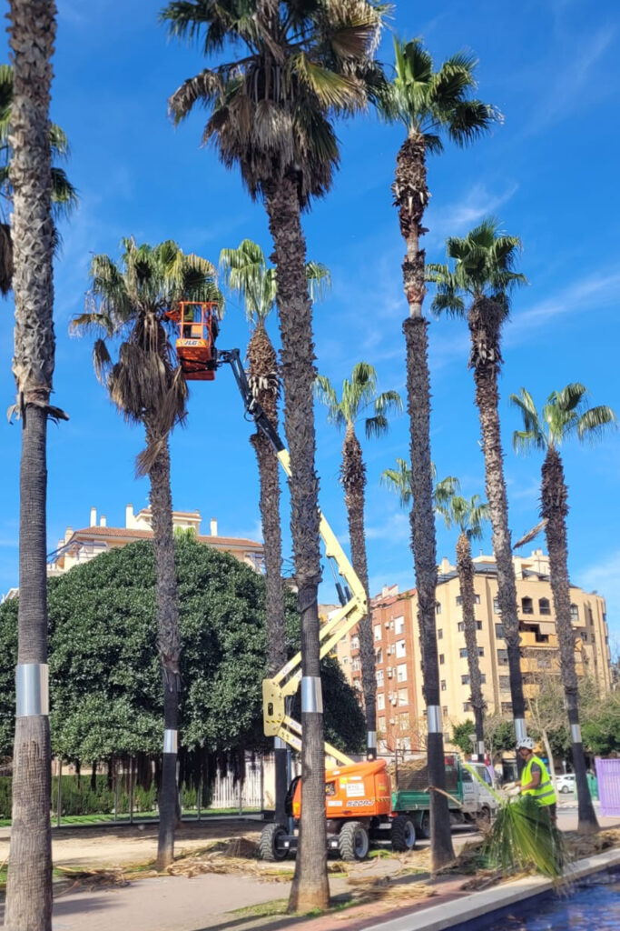 Solivent Paisatges ejecuta trabajos de conservación en Washingtonias en Alaquàs para reforzar la seguridad y el mantenimiento del viario urbano.